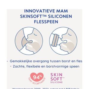 Het MAM-speentje met SkinSoft™ siliconen oppervlak maakt drinken van een fles oh zo vertrouwd voor baby's.